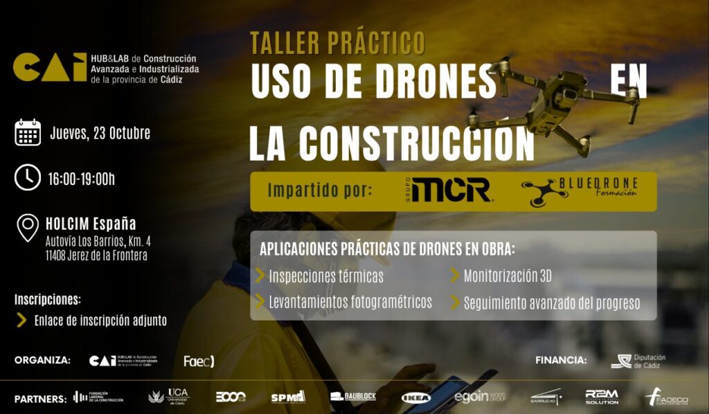 El Hub&Lab de Construcción Avanzada e Industrializada de la provincia de Cádiz (CAI), con la colaboración de FAEC Cádiz, Grupo MCR y Bluedrone Formación, y la financiación de la Diputación de Cádiz, organizará el próximo 23 de octubre el taller práctico “Uso de drones en la construcción”, que se celebrará en el Centro de Distribución HOLCIM Jerez.