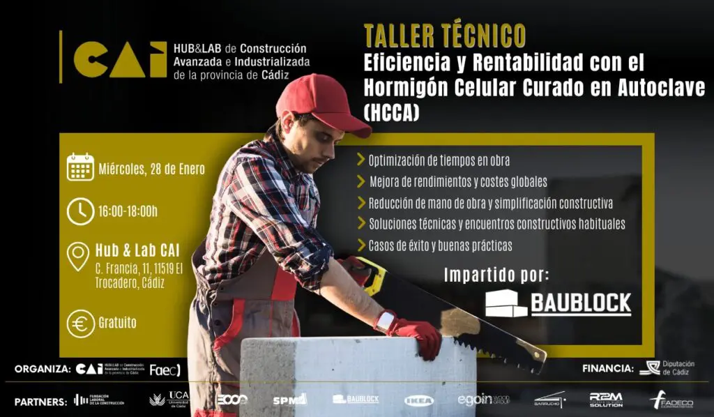 El Hub&Lab de Construcción Avanzada e Industrializada de la provincia de Cádiz (CAI), con la colaboración de FAEC Cádiz y la empresa Baublock, organizará el próximo miércoles 28 de enero, en horario de 16:00 a 18:00h, el taller técnico “Eficiencia y rentabilidad con el Hormigón Celular Curado en Autoclave (HCCA)”, que se celebrará en las instalaciones del Hub&Lab CAI.